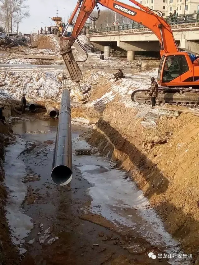 據(jù)伊春項目施工負責人孫成斌介紹,伊春市中心城供水工程,工程總造價為2496萬元,全長4.7公里,施工管徑分別為φ700和φ1200是伊春供水民生工程。由于伊春為山區(qū),水位高只能在冬季枯水期進行施工,施工線路需要橫渡三條河流,施工需要搭建圍堰,伊春市現(xiàn)在平均室外溫度在-25℃左右,施工作業(yè)條件十分艱苦。該工程現(xiàn)已完成工程量的50%,在元旦前完成主體管道安裝,全線完工應在春節(jié)前完成,在明年五月份完成剩余井室工作。