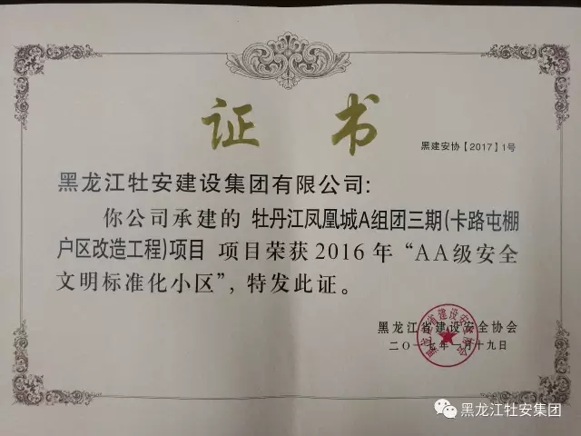 日前,由我公司承建的牡丹江鳳凰城A組團(tuán)三期(卡路屯棚戶區(qū)改造工程)項(xiàng)目和牡丹江鳳凰城A組團(tuán)C區(qū)項(xiàng)目,被省建設(shè)安全協(xié)會(huì)評(píng)為2016年度“AA級(jí)安全文明標(biāo)準(zhǔn)化小區(qū)”。張化民、李強(qiáng)分別被授予“全省建設(shè)安全管理優(yōu)秀項(xiàng)目負(fù)責(zé)人”稱號(hào)。對(duì)獲得榮譽(yù)的同志表示祝賀的同時(shí),也希望他們?cè)诮窈蟮墓ぷ髦薪潋溄湓暝俳釉賲?,充分發(fā)揮典范作用,繼續(xù)做好施工現(xiàn)場(chǎng)安全文明標(biāo)準(zhǔn)化工作,加強(qiáng)安全生產(chǎn)和文明施工管理,推動(dòng)我公司安全文明標(biāo)準(zhǔn)化工作提升水平,再上新臺(tái)階。